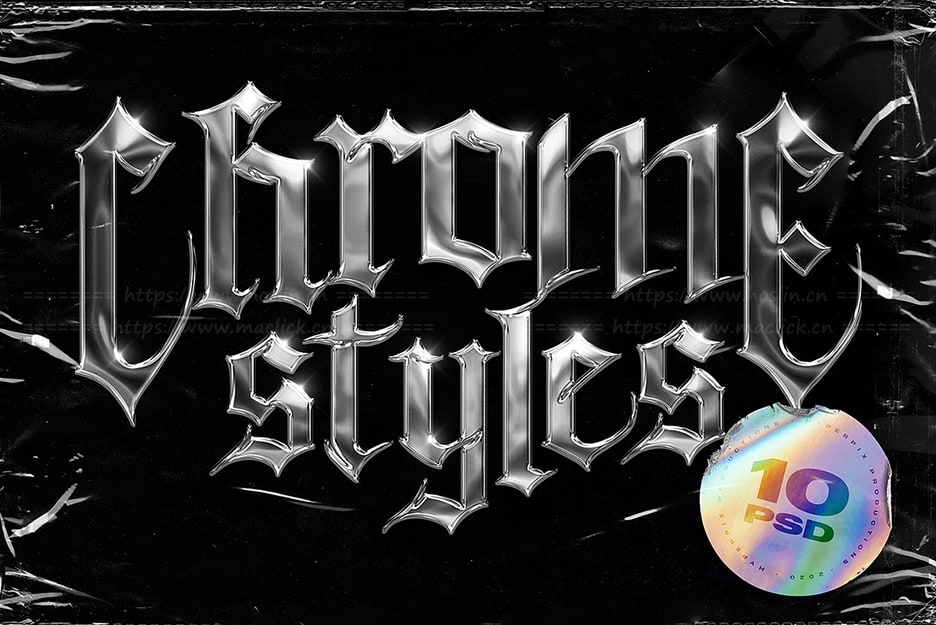 红森林 » 【PSD模板】复古酸性金属镀铬光泽纹理3D科幻哥特风概念艺术图形文本游戏品牌宣传设计PSD样式模板 Chrome Text Styles Vol.1