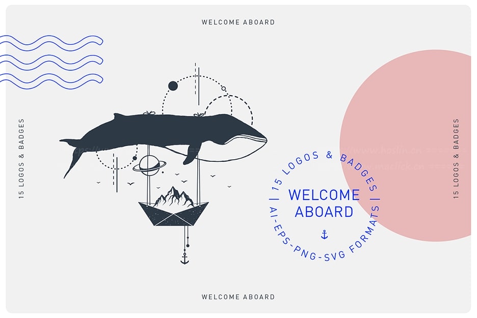 红森林 » 【矢量素材】15个创意复古海洋风LOGO标志T恤图案设计矢量分层模板素材 Welcome Aboard. 15 Logos & Badges