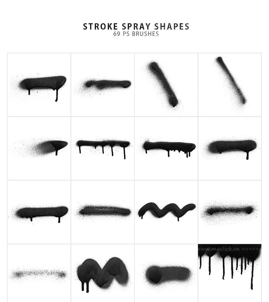 - 214个独特的喷涂效果(纹理喷雾,轻涂,斑点,渗漏,颗粒),最大5000像素大小