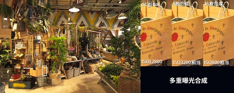 - 结合多张图像可以提高图像质量。例如,组合4张图像等效于ISO感光度3200,而组合16张图像等效于ISO感光度800。