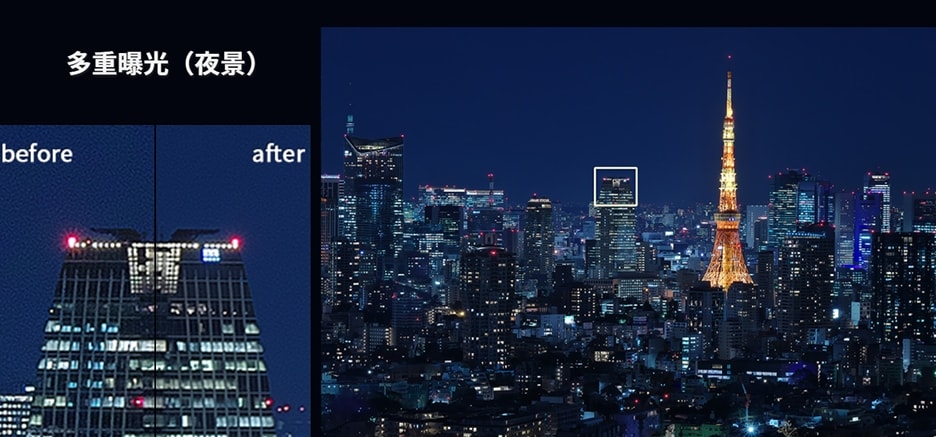 对要合成的图像进行同等处理,其结果与使用相机进行多次曝光相同。将在同一场景中拍摄的多张图像组合在一起,比使用常规的降噪方法更有效地创建高度详细和逼真的图像。