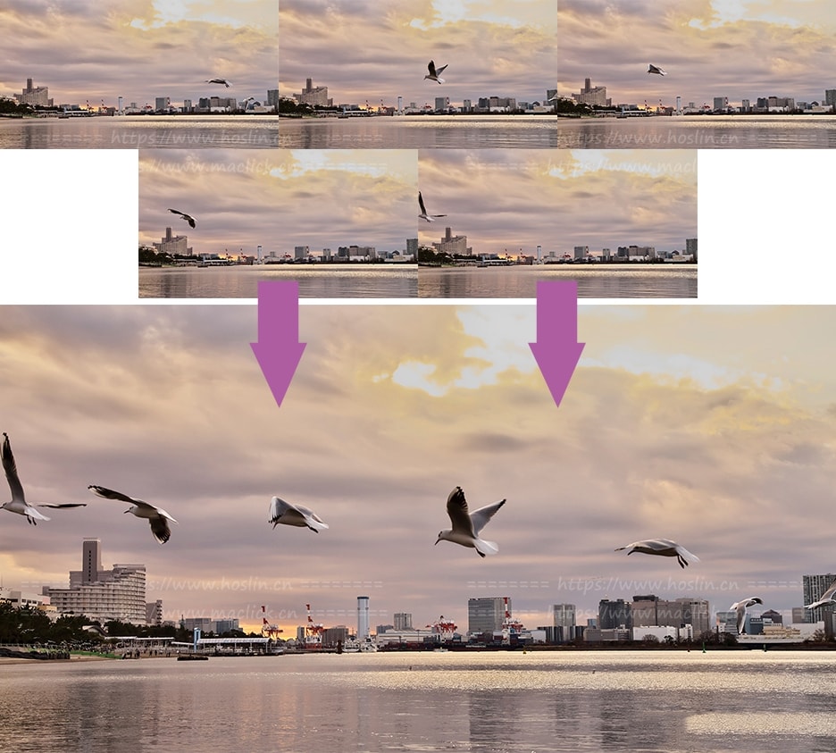 运动物体去除复合:从同一场景中的多个图像中删除移动的对象,并将它们组合为一个图像。使用这种构图模式,您可以创建超现实的图像。