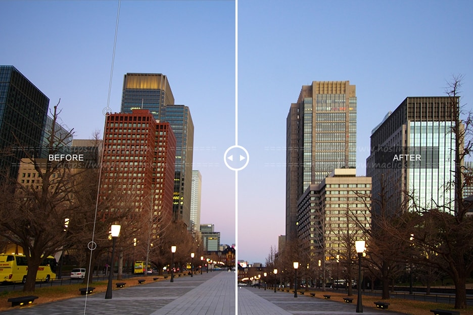 “透视校正工具”已添加到旋转/平移镜头效果中。如果使用广角镜拍摄建筑物的照片,则可以直观地使用预览中的“垂直/水平”校正工具来校正透视。