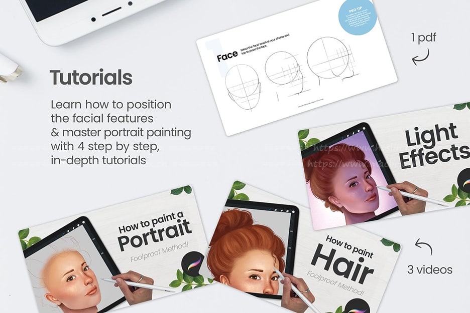 如果您不熟悉肖像画,还可以观看素材包中提供的分步深入视频教程,以学习如何像专家一样画脸。如果您是专业人士,则可以简化创作过程并节省宝贵的创作时间。