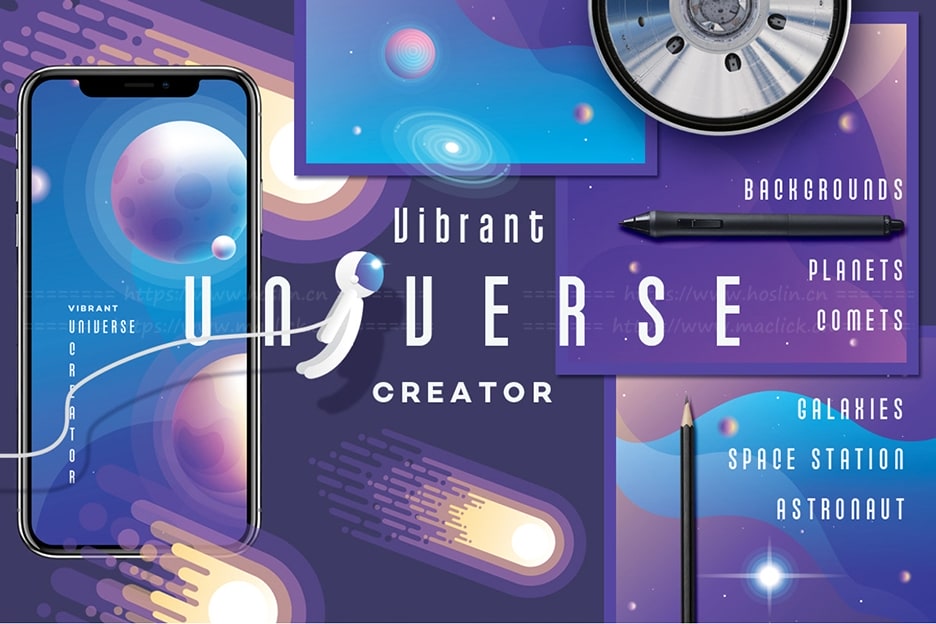 红森林 » 【矢量素材】63款深邃宇宙太空星空矢量背景彗星行星星系宇航空间站PNG图片素材 Vibrant Universe Creator