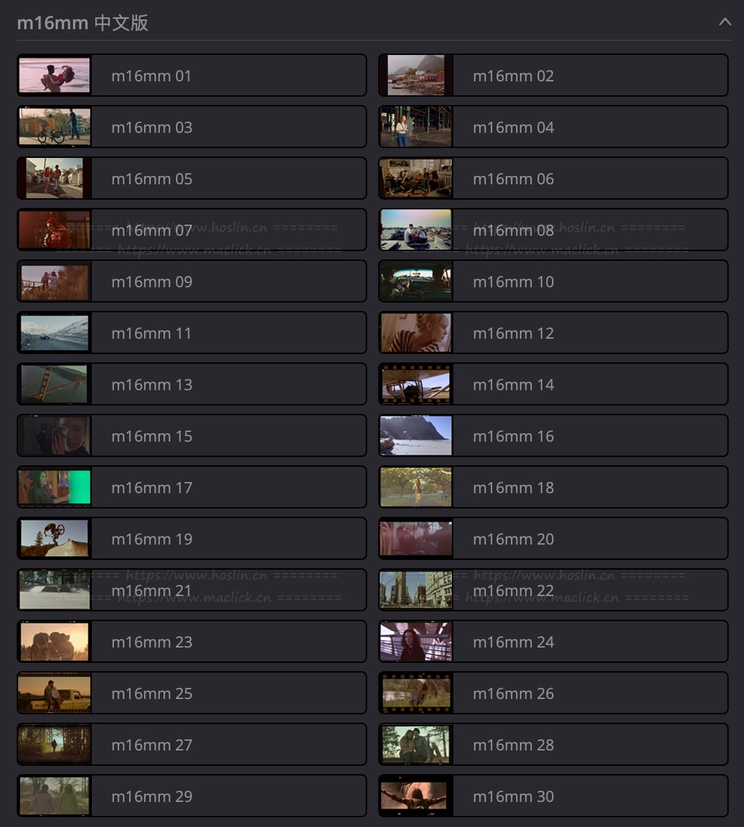 m16mm 这套达芬奇特效库提供30种复古怀旧电影胶片边框刮痕视觉预设,为你的视频添加胶片元素如边框、刮痕、噪点、光效等,可帮助您添加失真效果并在任何镜头中进行色调和光线调整。借助模拟电影外观预设,可以轻松应用颗粒、扭曲和划痕、高光发光,甚至模拟真实电影放映机的外观!多种参数可设置。