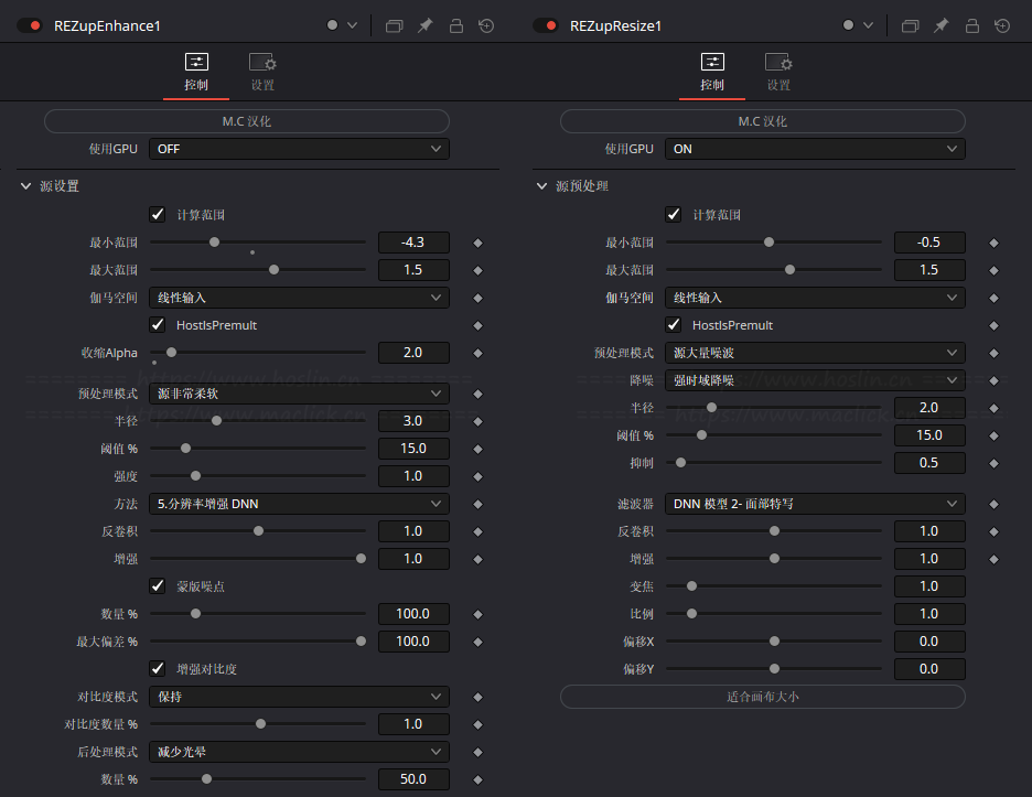 REZup Resize:添加缩放、比例和重构窗口,以处理各种升级场景。REZup Resize 已使用 2X、3X 和 4X 模型进行训练和测试,但是,在更大的升级倍数下,您可能需要使用时间降噪器(例如DE:Noise,也是 Effections 的一部分)对剪辑进行预处理,或先应用 REZup Enhance 以获得最佳效果。