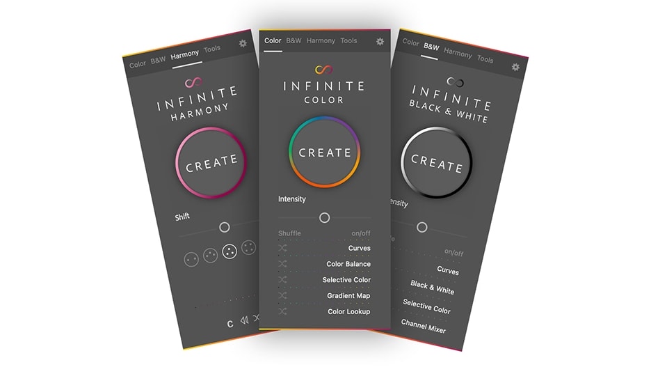 Infinite Color Bundle 将我们广受好评的 Infinite Color(无限色彩)Infinite Black & White(无限黑白)以及Infinite Harmony(无限和谐)这三款工具整合到一个面板中,一键即可随机创造无数专业色调,有效突破固定预设的束缚,助你打造专属视觉风格。插件使用简单,无需调整繁复菜单或滑块,仅需点击按钮即可生成并逐步优化,对创作流程更友好。一站式黑白与色彩管理,结合色彩与黑白调控功能,以及直观引导式色调创建插件 Infinite Harmony,让调色流程更高效快捷。