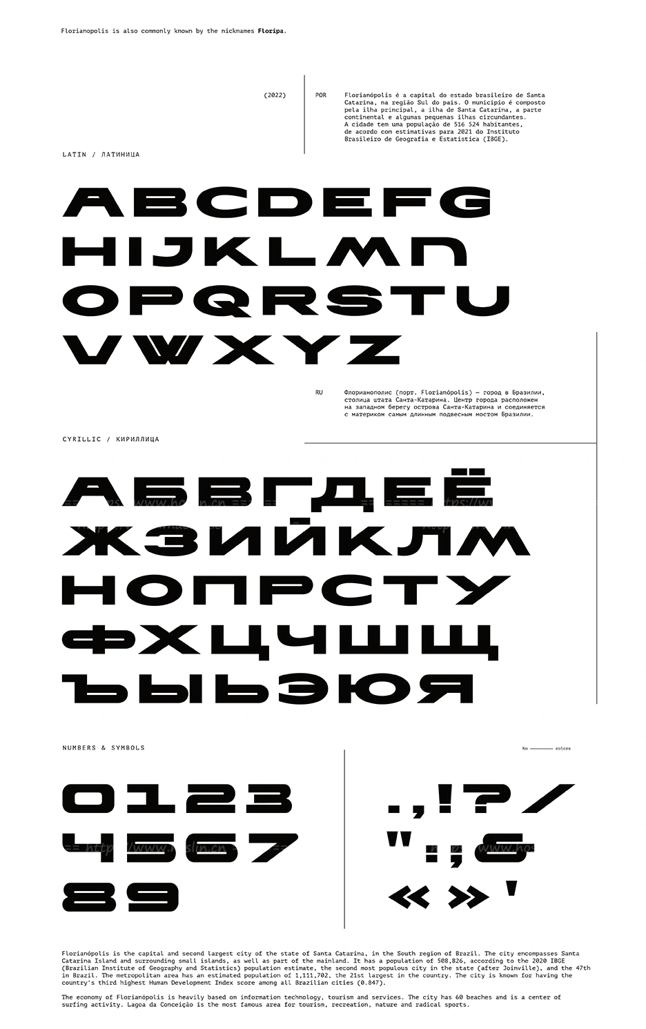 Floripa 是一款现代时尚的无衬线字体,每个字母都经过精心设计,让您的文本独具特色。它既适合用作标题,也适合用作正文。它仅包含大写字母,支持拉丁字母与西里尔字母系统。您可以将它应用于机器人与仿生人、高科技、未来科技、虚拟现实、太空、体育等众多领域的项目中。Floripa 字体设计风格干净、现代,有一定的厚重感与张力,很适合用于Logo、海报、标题排版,包装设计等这类需要视觉冲击力的场景。