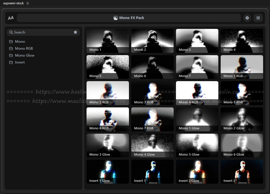 Mono FX Pack 是为 After Effects 用户设计的视觉效果工具包,包含 24 种手工打造的高对比单色与反转效果。它可以快速为素材添加大胆、颗粒感强、风格化的黑白或色彩反转视觉效果,适用于音乐视频、时尚剪辑、实验影片等创意项目。内置模块化结构可调整阈值、对比度、光辉、颗粒、混合等参数,并支持 AAPower 扩展插件一键应用、自动适应分辨率,无需第三方插件即可提升视频风格表达力。