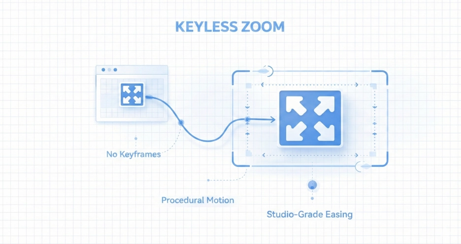 Keyless Zoom 的核心功能是其程序化相机引擎,你只需定义动画的起点、终点以及持续时间,Keyless Zoom 会自动计算镜头运动、缓动过渡和空间数学关系,生成流畅自然的相机缩放效果。Keyless Zoom 内置了 四种手工调校的高级缓动样式:平滑、快速、电影和回弹,每种缓动风格都各具特色,从而创造出流畅自然、富有表现力且始终保持高品质的运动效果。