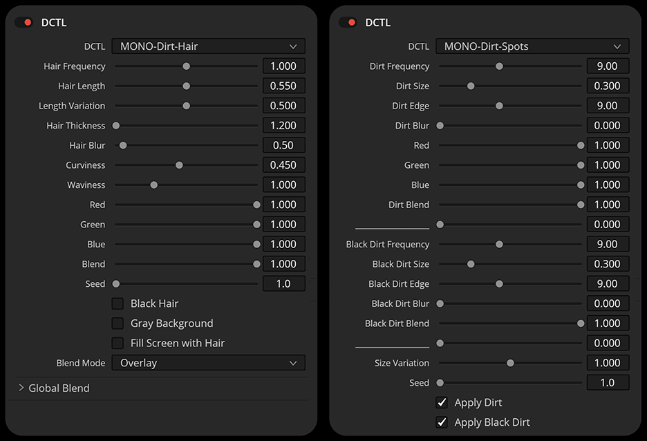 包含两款 DIRT DCTL 插件都提供了丰富的控制选项,用于塑造胶片上的污垢、灰尘和纤维的外观和效果。您可以调整效果的频率、大小和整体强度,还可以微调其与图像的融合方式。内置的预览选项,例如灰色背景和填充屏幕,让您在工作时能够清晰地查看调整结果。这些工具结合起来,提供了一种灵活直观的方式,可以将真实的模拟瑕疵添加到数字影像中。