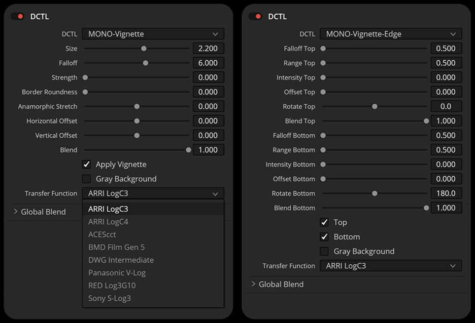 这两个暗角 DCTL 插件都提供了对图像形状和边缘衰减的精细控制。您可以调整大小、强度和衰减等参数来定义光线分布,或使用“边框圆角”、“变形拉伸”和“偏移”等控件来优化外观。预览选项(例如“灰色背景”)有助于在工作时精确地可视化形状。
