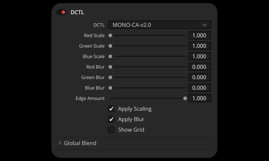 当镜头无法将所有波长的光线聚焦于同一点时,就会出现色差。每种颜色的光线在穿过镜片时都会以略微不同的角度折射,从而在高对比度边缘或图像边缘附近产生细微的红色、绿色或蓝色边缘。此 DCTL 通过为每个颜色通道提供独立的缩放和模糊控制来模拟这种色散效应。可选功能(例如“边缘量”和“显示网格”)可提供精确的控制和可视化效果。