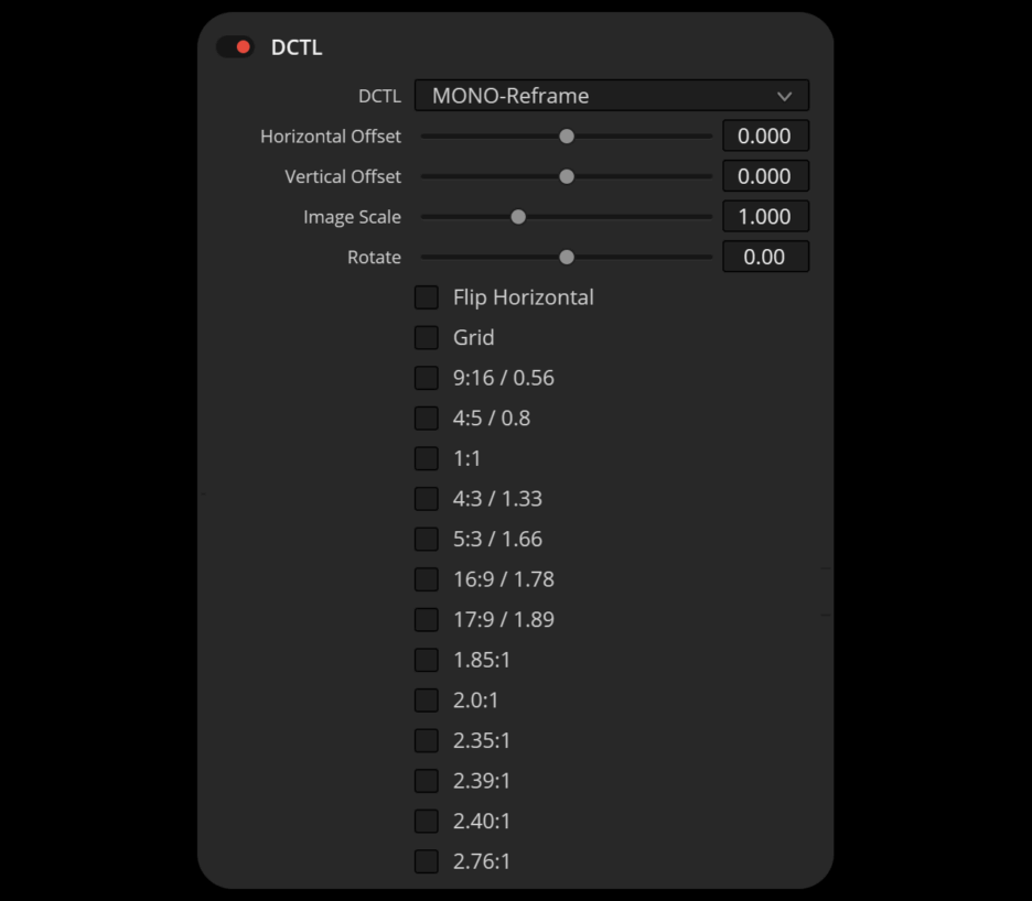 此 DCTL 插件提供缩放、旋转和偏移滑块,以及水平翻转和网格显示选项。16:9、4:3 或 2.39:1 等宽高比参考线有助于在各种交付格式中实现精确的构图和对齐。