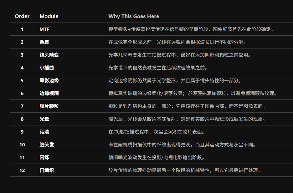 此顺序反映了真实感光胶片和现代胶片扫描工作流程中的成像方式。每个模块都根据其特性产生的阶段进行定位:镜头、乳剂、胶片基片、扫描、放映。如果您想要模拟扫描后的底片效果(例如,Vision3 + Spirit/Scanity/Arriscan 工作流程),请使用此顺序。这样可以生成现代胶片电影中常见的“电影数字中间片”效果。