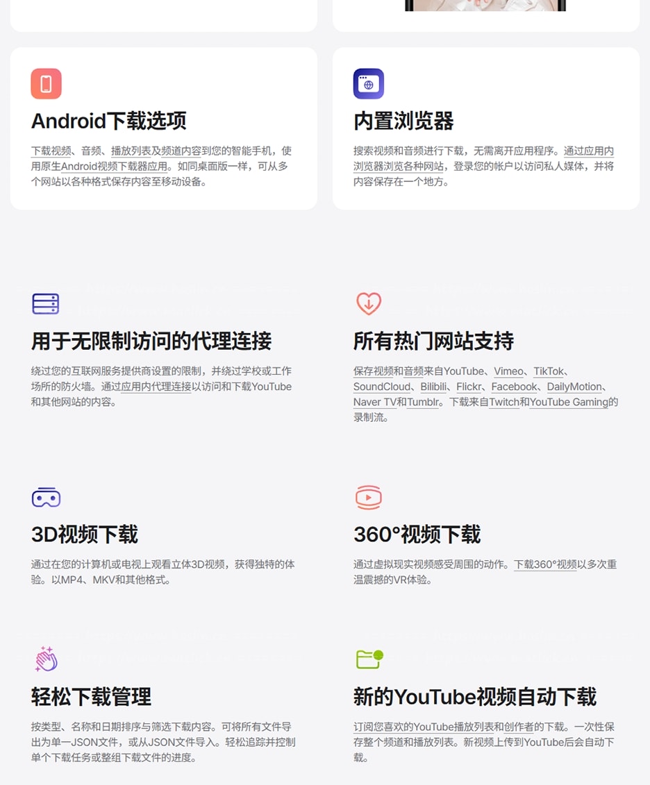- 🔹高清视频下载与格式支持:它支持多种分辨率,包括 720p、1080p、4K UHD 和 8K UHD(取决于源视频质量),并能保持原始画质与音频同步下载。下载的视频可以保存为 MP4、MKV 等常见格式,方便在电视、手机或平板等设备上播放。
