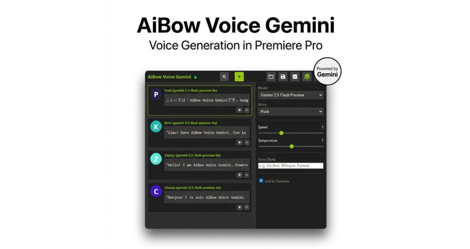 AiBow Voice Gemini 是专为 Premiere Pro 设计的 AI 语音合成插件,将先进的Google Gemini 2.5(Flash/Pro)模型直接集成进剪辑流程,实现高质量、自然流畅的语音配音生成,无需跳出软件操作传统的生成-下载-导入流程。用户只要在插件界面输入文字脚本、选择声音类型和语音风格,点击即可即时生成配音并自动插入时间线,提升编辑效率和创意节奏。