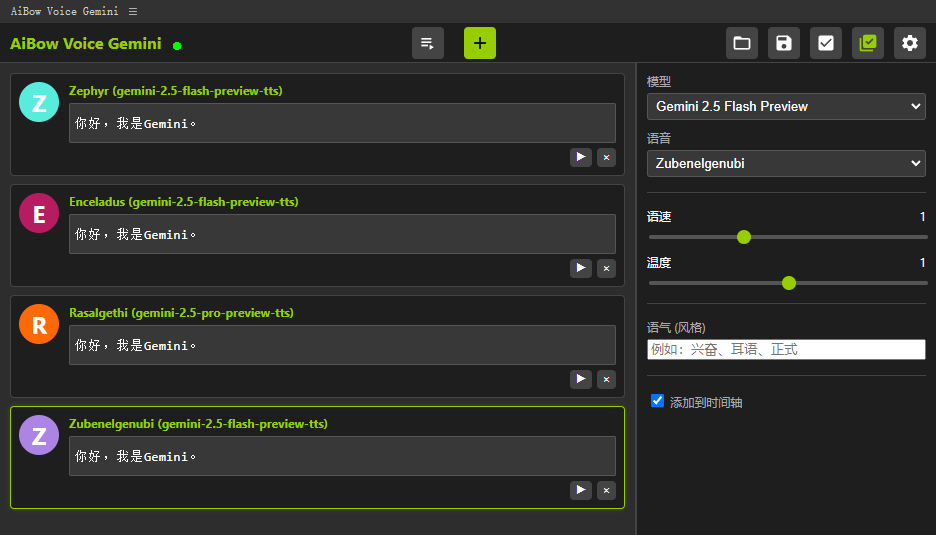 AiBow Voice Gemini 支持包括男女声、多种语言及情绪表达的丰富声音选项,还允许通过自然语言提示调整语音风格(如“温暖、正式、轻快”等),适合制作教程解说、广告旁白、纪录片叙述等内容。整个语音生成过程基于云端计算,无需本地硬件加速,轻便且高效。使用此工具需要您自备Google Gemini API 密钥。