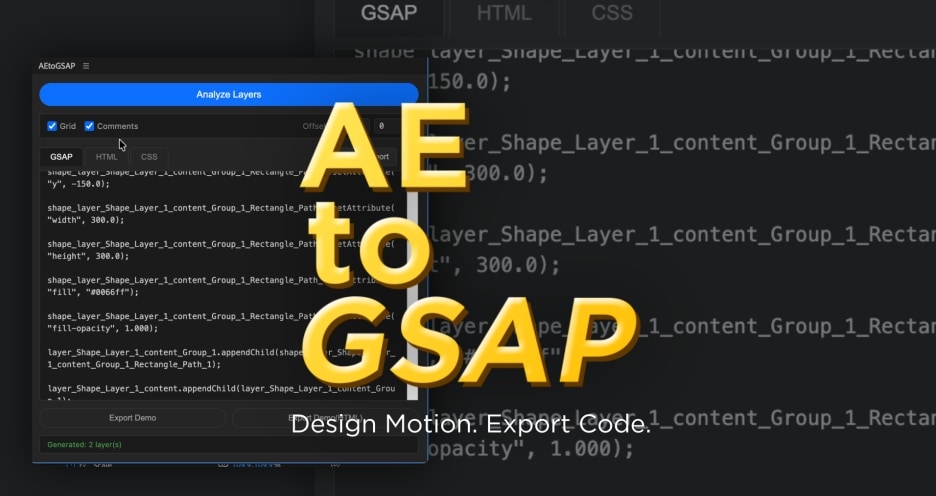 AEtoGSAP 可以将 AE 的动画一键导出为网页友好的 GSAP(GreenSock Animation Platform)代码。它支持将 AE 中的关键帧、时间线、持续时间和自定义缓动曲线完整保留并转换成干净、可运行的GSAP JavaScript、HTML 和 CSS 文件,方便直接在网站中呈现原动画效果,无需重做。使用时只需选择动画图层进行分析导出,就能生成可即时预览的网页动画输出。它支持形状图层、文字图层、Null 层和父子关系动画等基本元素,同时保留缓动效果,让交互动画在 Web 端看起来流畅自然。此工具适合动效设计师与前端开发协作,将 AE 制作的动画转为网站动效、微交互、UI 动画等真实可运行的网页内容,加速视觉设计到 Web 实现的工作流程。
