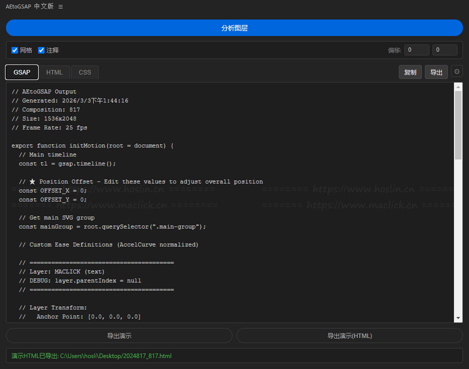- 生成 HTML / CSS / GSAP 文件以供即时预览