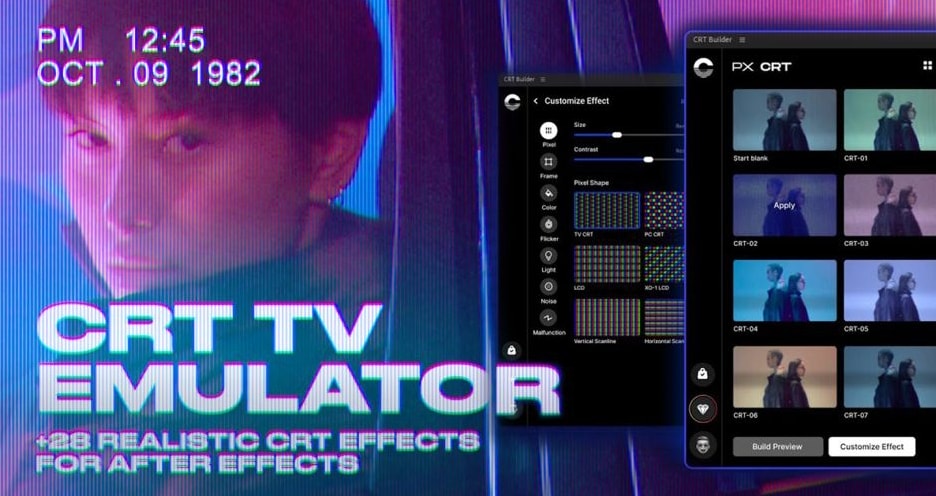 CRT TV Emulator 可以帮助您重现老式CRT电视和显示器的复古外观和风格。创建特效非常简单,只需拖放即可,而且它还允许您自定义视频素材的每一个细节,从像素的形状和排列到电视画面的故障和闪烁,无所不包。它除了常见的像素化、扫描线、亮度闪烁、信号噪点等基础 CRT 风格外,还能自定义像素形状、屏幕曲线、光线闪烁、干扰与瑕疵等细节,让画面更像真实的老式电视机或监视器输出。适合用于音乐视频、复古风片段、电子产品展现等场景。拖放式操作简单直观,同时可细调各项参数满足不同复古程度的设计需求。