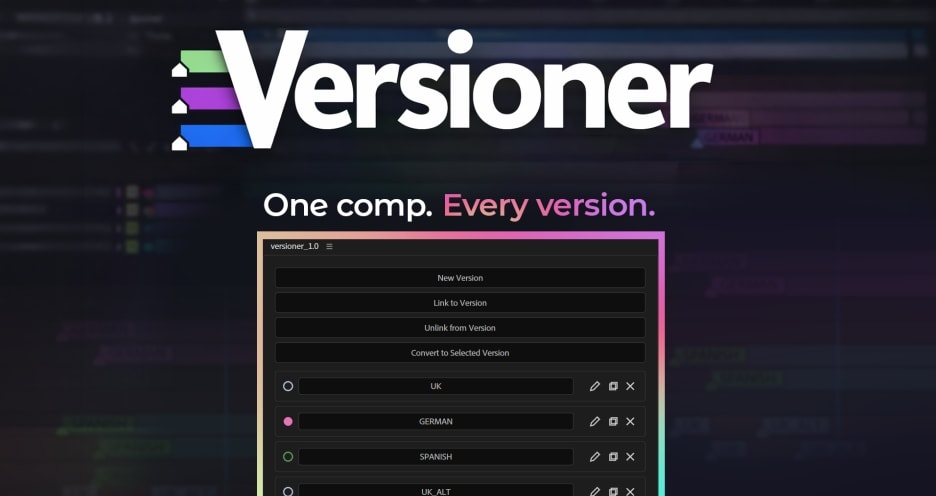 Versioner 是一款 After Effects 版本管理工具,为需要制作多语言或多版本内容的项目而设计。通过它,你可以在同一个项目或合成中管理不同版本的内容,而无需复制多个工程文件,大大简化复杂项目的管理流程。Versioner 的核心功能是为图层标记版本标签。用户可以将特定图层分配到不同版本(例如不同语言、客户定制版本或不同文案方案),然后通过一键切换版本,自动启用对应图层并隐藏其他内容,从而快速预览和输出不同版本的视频。