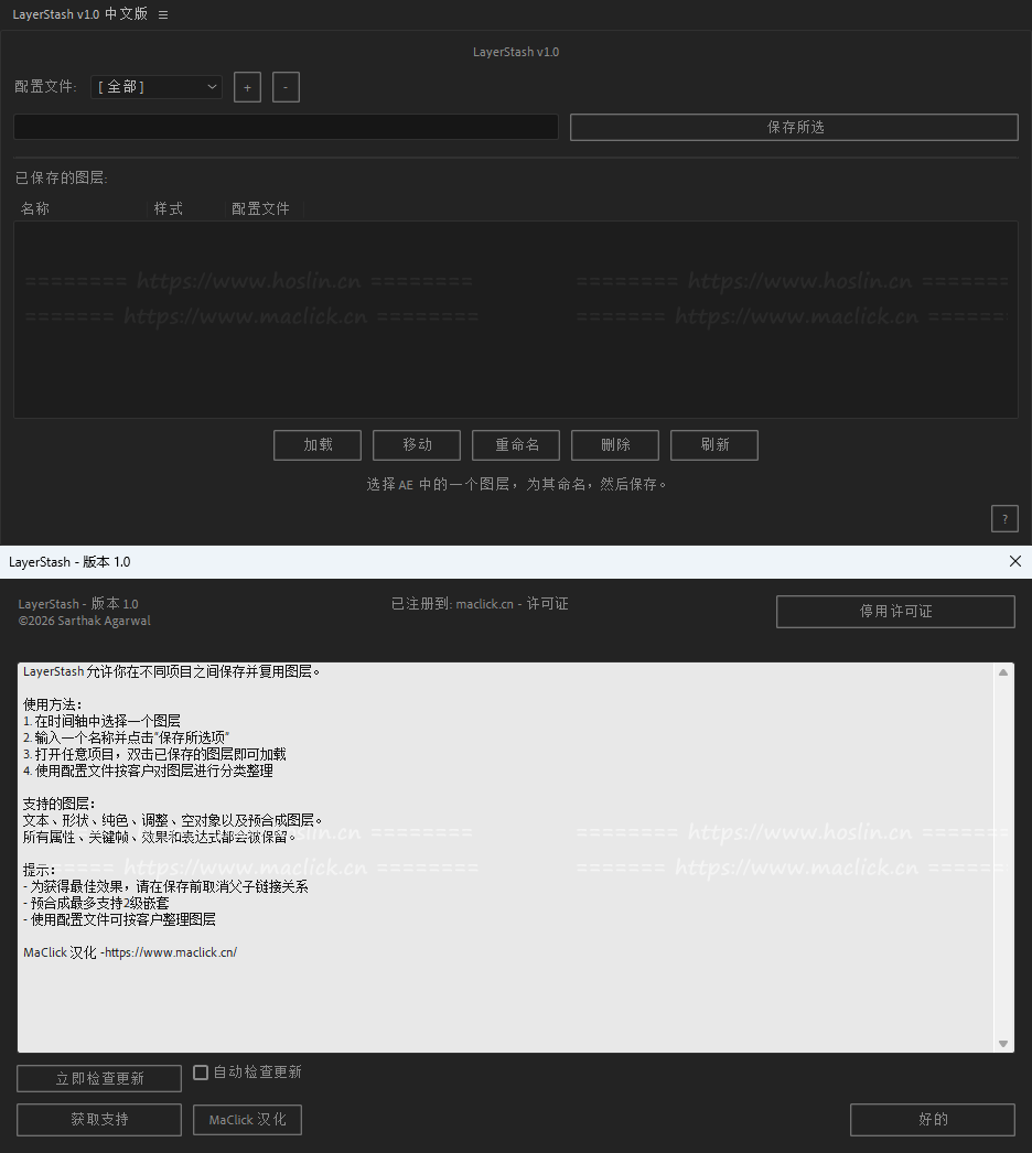 一键即可保存任何 After Effects 图层及其所有属性,并一键将其加载到任何项目中。文本图层、形状图层、调整图层、预合成——所有图层的关键帧、效果和表达式均得以保留。按客户和配置文件进行整理。告别重新制作,开始重复使用。使用 After Effects 预设时,您仍然需要创建图层、应用预设并进行调整。而使用 LayerStash,只需单击一下,整个图层即可准备就绪:字体、动画、关键帧、特效,应有尽有。***提示:不要用中文版AE,中文版表达式会报错