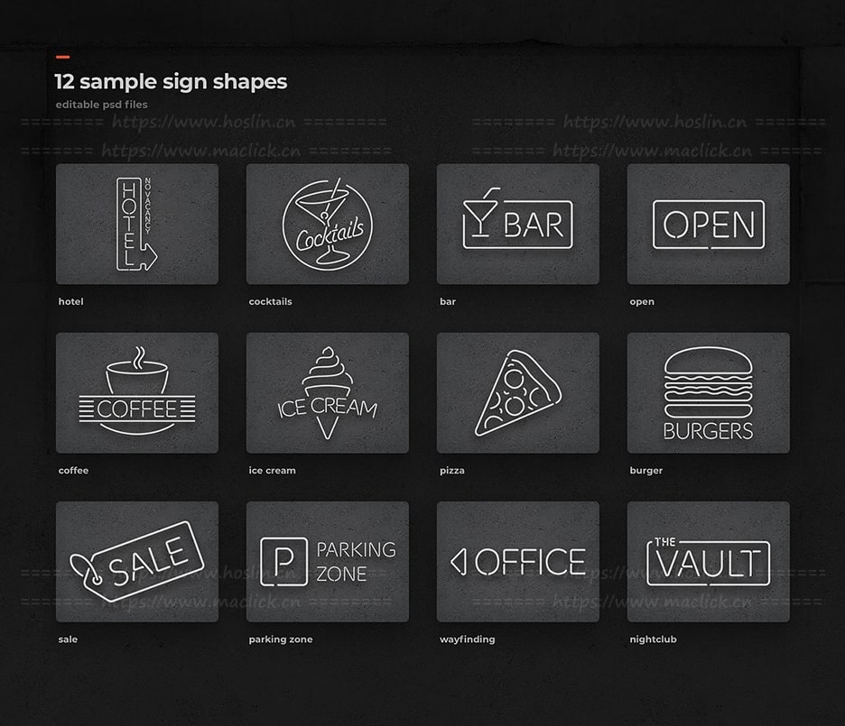 红森林 » 【PS模板/样式】都市夜色酒吧店招霓虹灯管电路配件元素PS文字模板样式设计套件 Neon Sign Kit