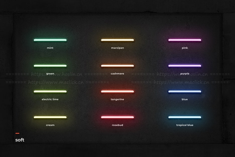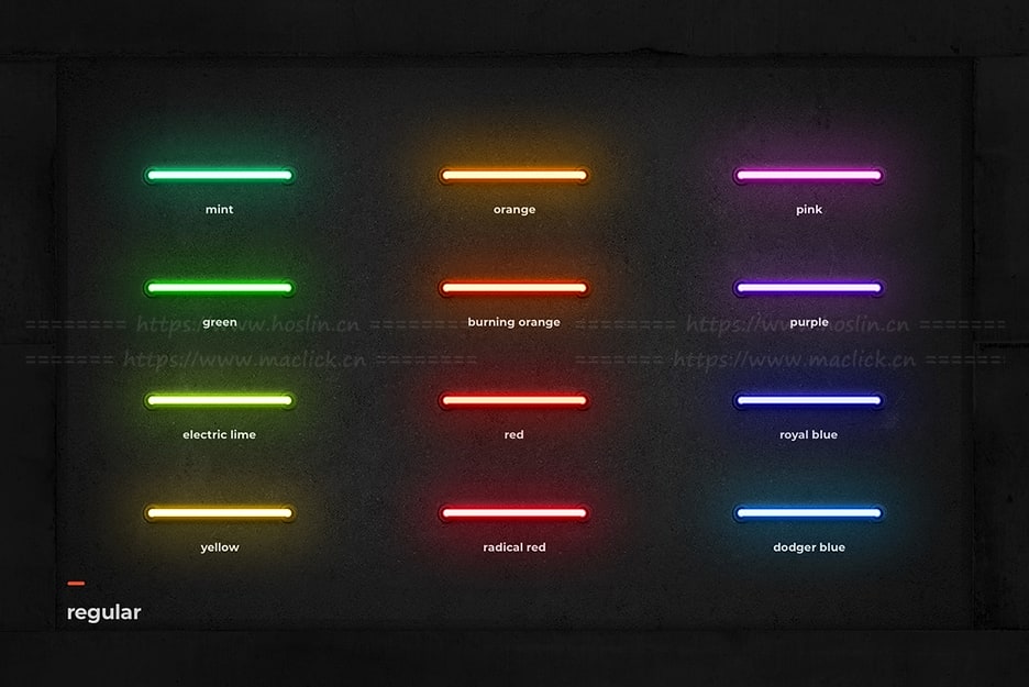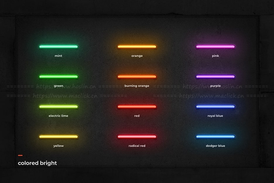 - 五种霓虹灯管风格类别(普通、亮色、柔和、彩色、彩色亮色)