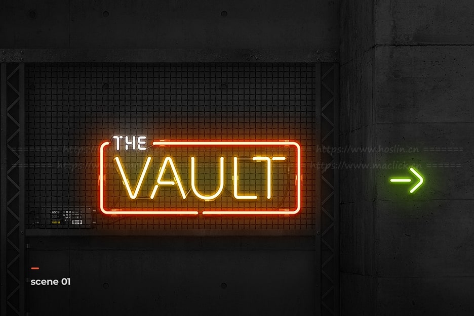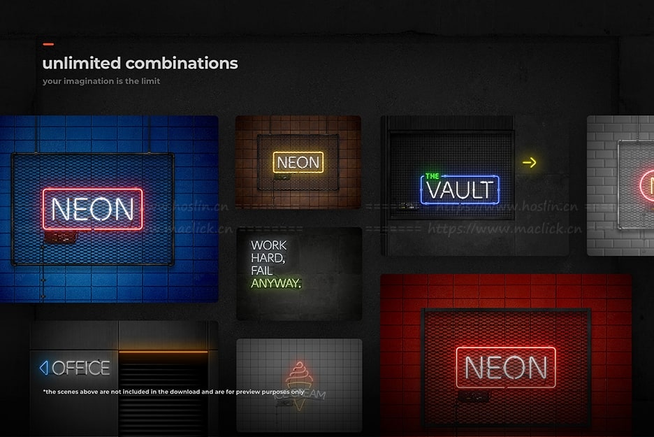 一套庞大的霓虹灯招牌工具包,包含数十种霓虹灯样式、霓虹灯字体、40 种背景和数百个辅助元素。