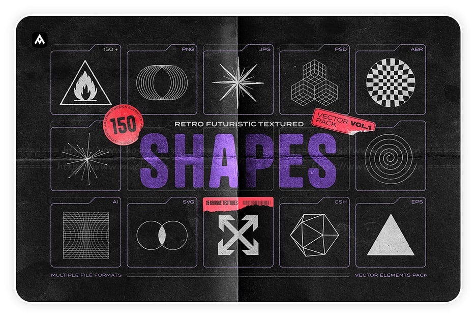 红森林 » 【矢量素材】150款科幻抽象复古艺术几何图形AI创意设计元素矢量素材 150 Retro-Futuristic Textured Shapes