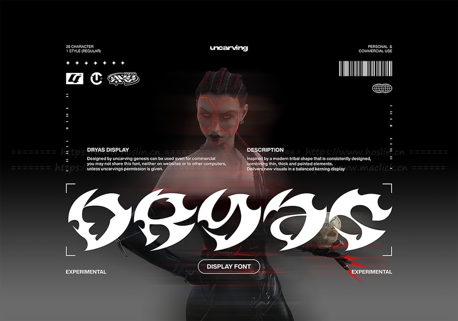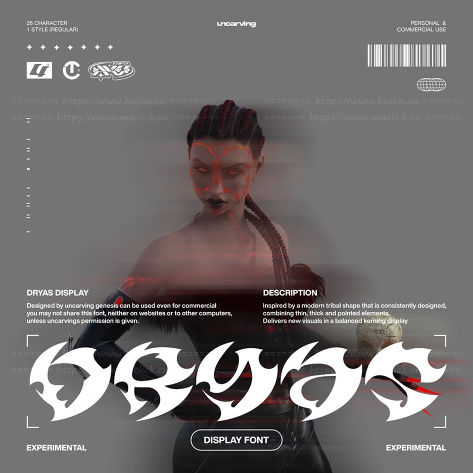 红森林 » 【字体】神秘抽象部落图腾艺术图形Y2K风格创意设计英文字体 Dryas – Display Font