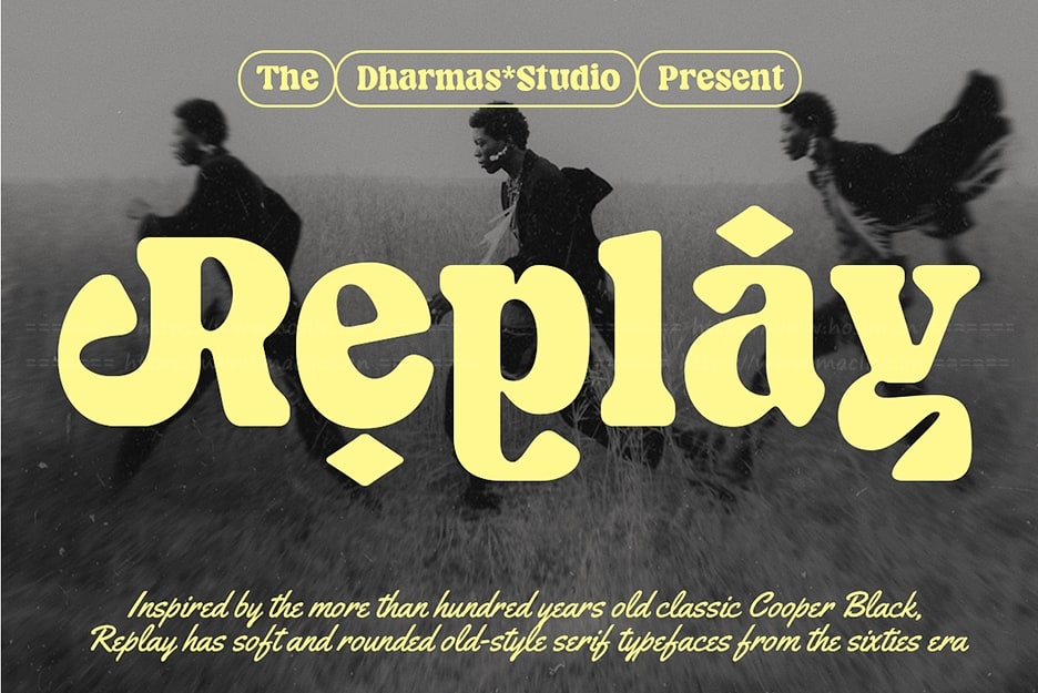 Replay 灵感源自 Cooper Black 一百多年的经典设计,Replay是一款柔和圆润的六十年代复古衬线字体。Replay字形简洁百搭,不仅适用于标题展示,也适合阅读。
