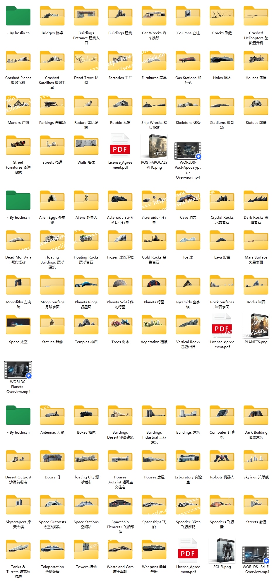 打造沉浸式末日废土与灾后重建场景。Vol.1 聚焦废墟美学,收录各类坍塌建筑、损毁载具与荒芜地貌,是制作灾难片、末世题材与生存剧情的理想素材库。类别示例:断桥、废墟楼房、撞毁直升机/飞机、残破车辆、枯树、工厂、加油站、瓦砾堆、骷髅、坍塌街道、防御墙、雷达站、沉船残骸等。 - Worlds – Vol.2: Sci-Fi 1,300+ 资产 | 28 类别