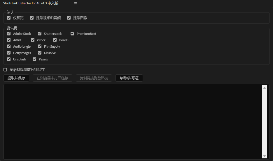 - 提取并保存:从项目中使用的素材中提取所有预览 URL 链接,并保存到 TXT 和 XLS 列表文件中!无需手动查找文件名或搜索历史记录。只需单击一下即可完成。