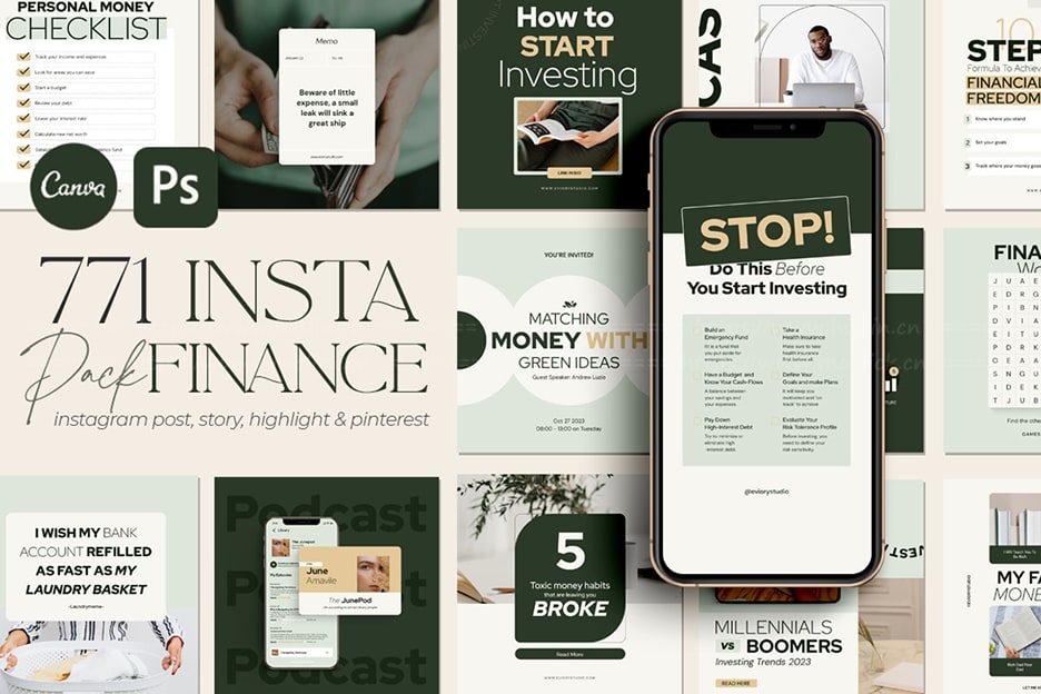 红森林 » 【PSD模板】741款简约时尚INS风社交媒体电商品牌营销推广海报封面排版设计PS/Canva模板 Financial Instagram Creator CANVA PS