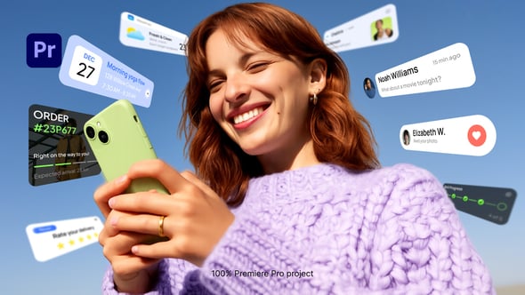 Notification Bars 是一款现代化的动态设计模板,采用智能手机风格的通知栏动画。该模板旨在提供简洁、快速且易于理解的沟通体验,帮助您以清晰的视觉方式突出显示收到的消息、提醒、通知、更新和社交互动。非常适合用于宣传片、应用演示、社交媒体视频、用户界面场景、讲解视频、科技内容、生活方式剪辑、广告、YouTube 视频、短视频和数字故事讲述。