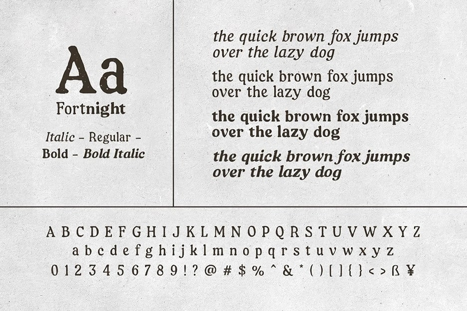 Fortnight 字体仿佛是你在旧书店里偶然发现的珍品 – 饱经风霜,质感丰富,充满复古韵味。这款手绘衬线字体家族,为那些想要营造沉稳、个性、略带怀旧气息的设计,增添了一抹恰到好处的粗犷魅力。Fortnight 提供四种富有表现力的样式:常规体、斜体、粗体和粗斜体供你选择,是设计包装、海报或标题的理想之选。它支持多语言,并包含完整的大小写字母、数字和标点符号,拥有足够的灵活性,助你打造充满灵魂的故事。