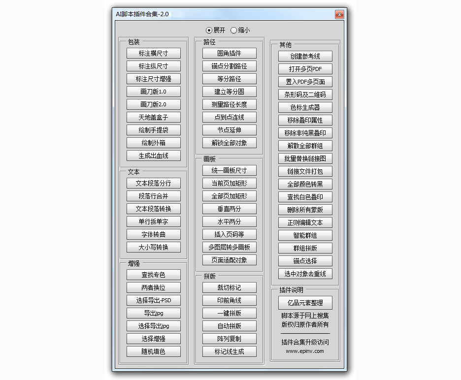 AI脚本插件合集2.0版,本站测试正常支持 Illustrator CC 2019(Win/Mac)。此AI插件包目前有62款ai脚本插件,已经整合成插件面板的形式,方便在AI中直接调用。