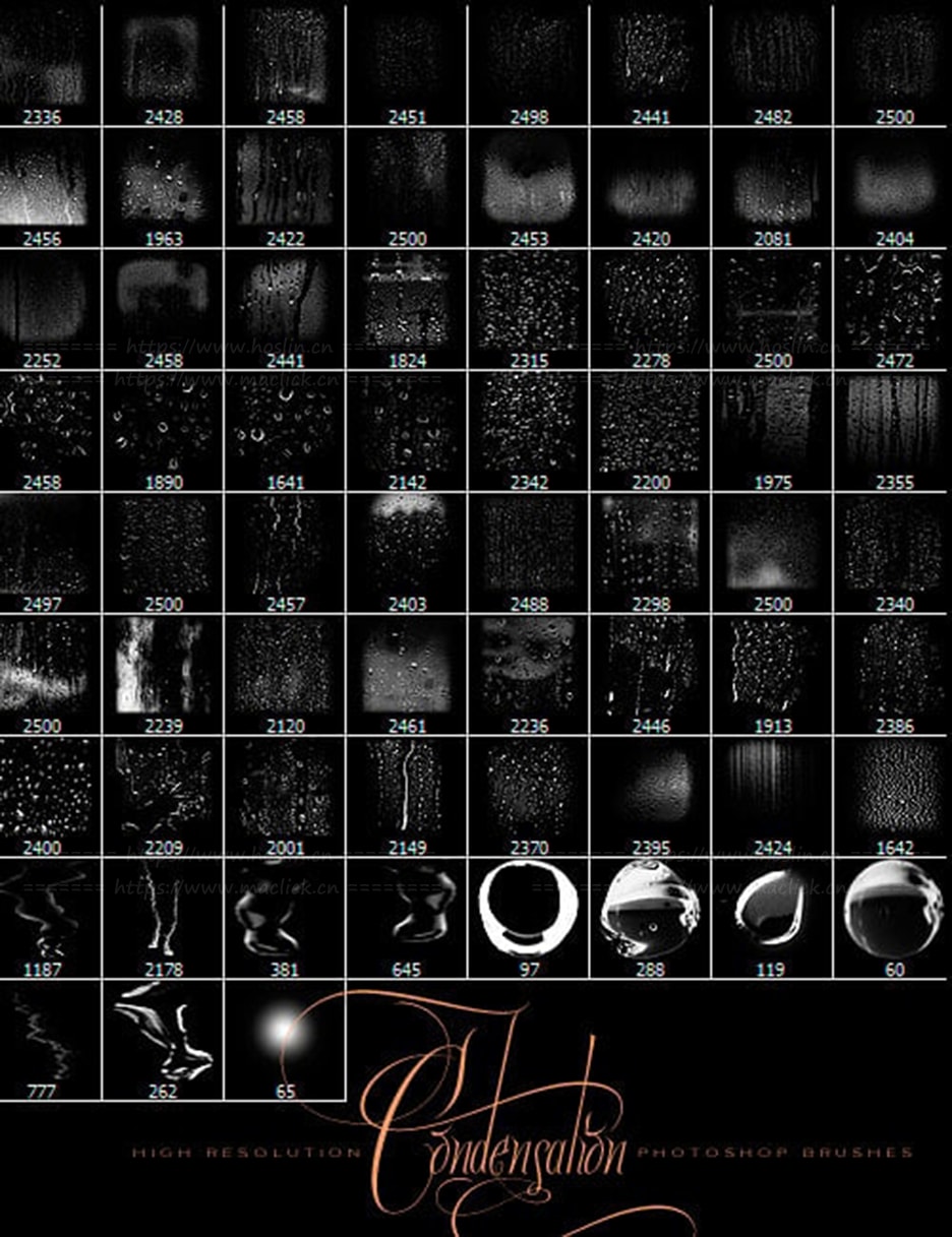 红森林 » 【PS笔刷】67款高清逼真玻璃水珠凝露水滴水雾雨水PS笔刷ABR画笔预设 Rons Condensation