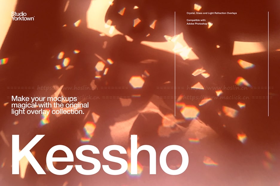 Kessho 是 10 张专门拍摄的用于模型的高分辨率光折射覆盖图的集合。现在,您可以添加美丽的有机玻璃和水晶折射效果,为您的图像增添特殊而独特的感觉。只需将叠加层放置在图像上,然后将混合模式更改为“线性光”将模型的真实感提升到一个新的水平- 保证让您的作品在客户、作品集、Pinterest 等平台上脱颖而出!