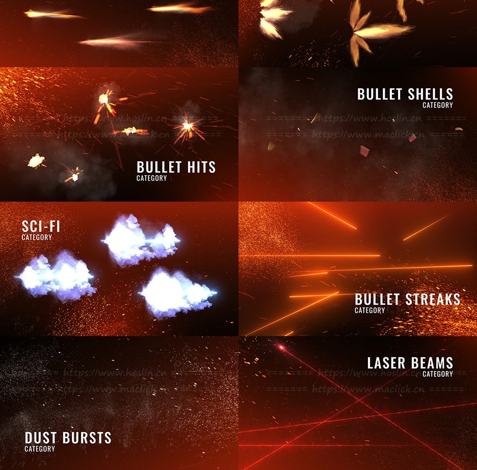 Real Muzzle Flash Kit 从14个独特类别中选择230种动作元素:大枪、前视图枪、机枪、步枪、前视图步枪、小枪、被压制的枪支、被抑制的步枪、科幻枪、子弹点击、子弹壳、子弹条纹、尘暴、激光束。每个元素都已预先加载到After Effects中,以使其完全易于使用。