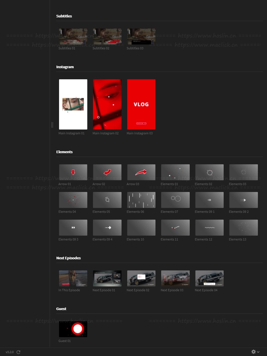 模板包括:开场片头、过渡、元素、信息栏、链接栏、下三分之二、下一集预览、评论栏、引号栏、订阅电话、印刷标题。