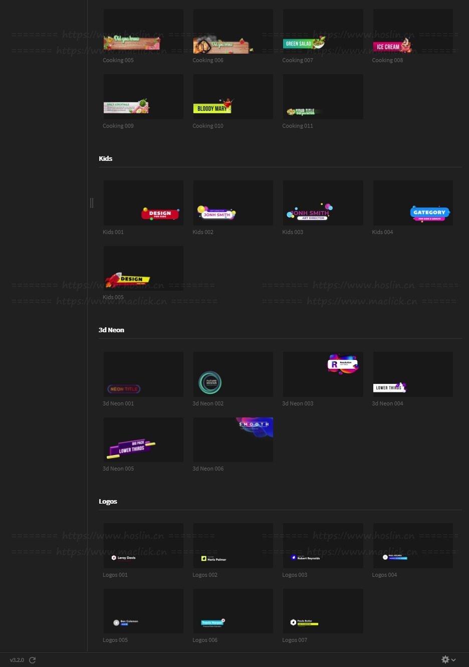 模板包括12个类别:基本、创意性、时尚、3d /霓虹灯、烹饪、孩子们、社交媒体、毛刺、新闻、广播、动能、商标。