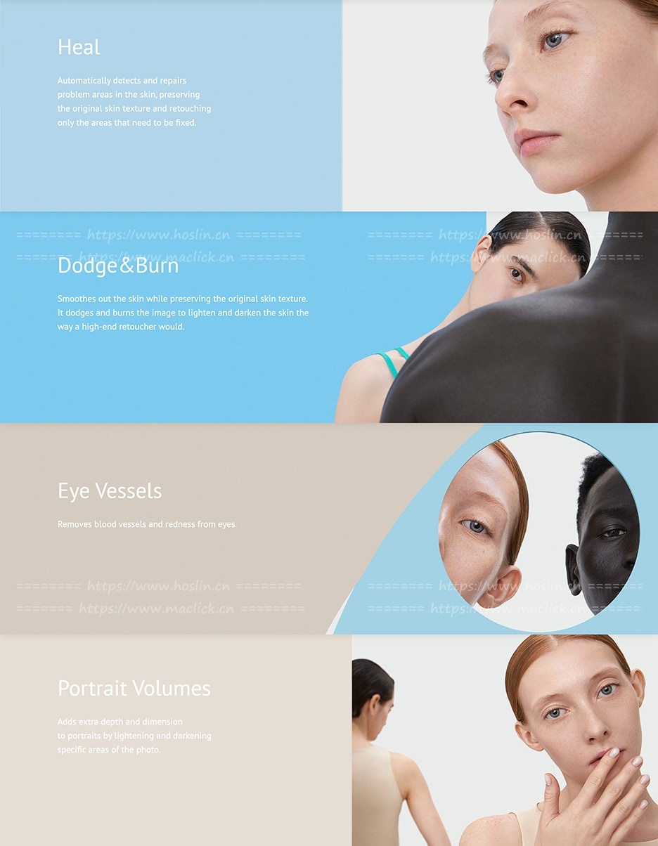- 高端皮肤修复:Retouch4me Dodge&Burn 使用高端修饰器使用的减淡和加深技术自动修饰人像。