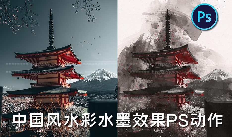 红森林 » 【PS动作】一键生成手绘水墨水彩画效果中国风照片PS特效动作 Asian Watercolor Photoshop Action