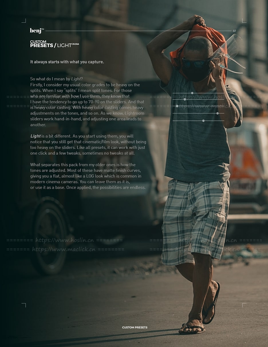 benj™| Light明亮效果由8种(另外3个作为赠送,共11个)预置组成,并于2021年首次发布。您可以轻松地进行渐变,但是尽管如此,电影般的感觉似乎仍然是我的最爱。每个预设都有特殊的外观,但是在色调上仍然保持不变。