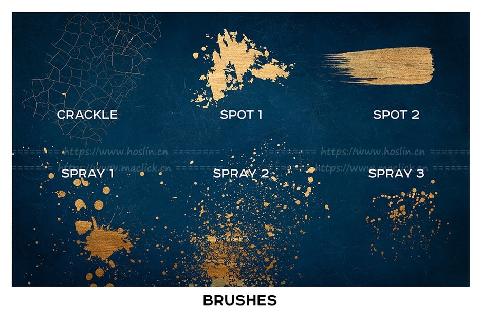 在此产品中,您将收到一个PSD模板,用于快速应用现成的预设效果。只需放一张照片,然后选择带有金色纹理,铜绿,划痕或飞溅的类型,纸张纹理以及应用黑白复古颜色进行处理的功能即可。当然,也可以使用一组画笔创建自己的纹理。