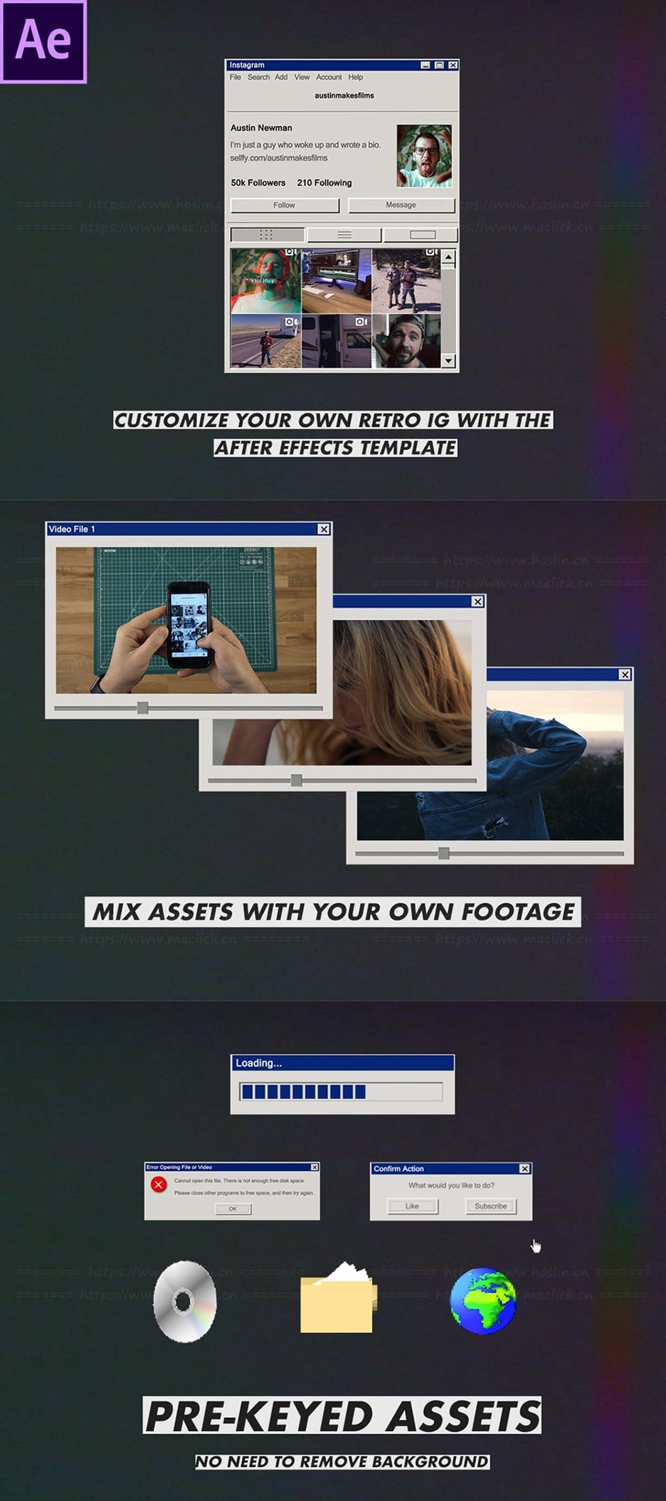 90’s Computer Editing Pack 拥有 19 个编辑元素,是怀旧编辑的数字梦想。从错误屏幕到复古程序 – 您将能够立即组装复古界面。共包含4背景,5弹出窗口,3错误故障,3图标和4其他。还包括AE和PR模板,不包含音效。